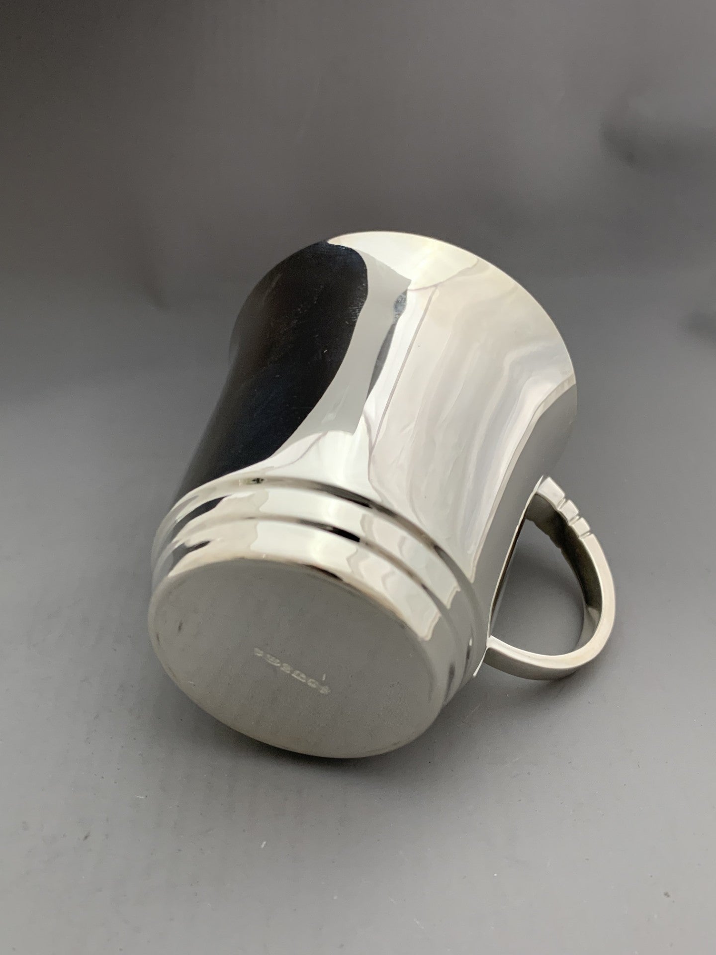 The Art Deco child can is a heavy weight of more than 100g of hallmarked sterling silver, beautiful polishing throughout, and a pure gold plated interior. The design is a nod to the art deco period, which emphasised plain silver with strong angular details and shapes. The can showcases this with the stepped detail in the bottom of the body and handle. The beauty of art deco silver design is it’s timeless appeal, always looking modern and relevant.